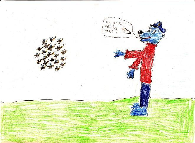 Die Bienen gaben mir genügend Honig und zusammen machten wir eine Honigspur und eine Honiggrube. Als wir fertig waren, bemerkte Käpt’n Braunbär, den Honig und schleckte die ganze Honigspur bis zur Honiggrube ab, dann sprang er hinein und schleckte den ganzen Honig weg. Wir ließen ihn in dem Loch, sodass jeder ihn sehen konnte, doch wir stellten noch ein Schild davor, auf dem stand: